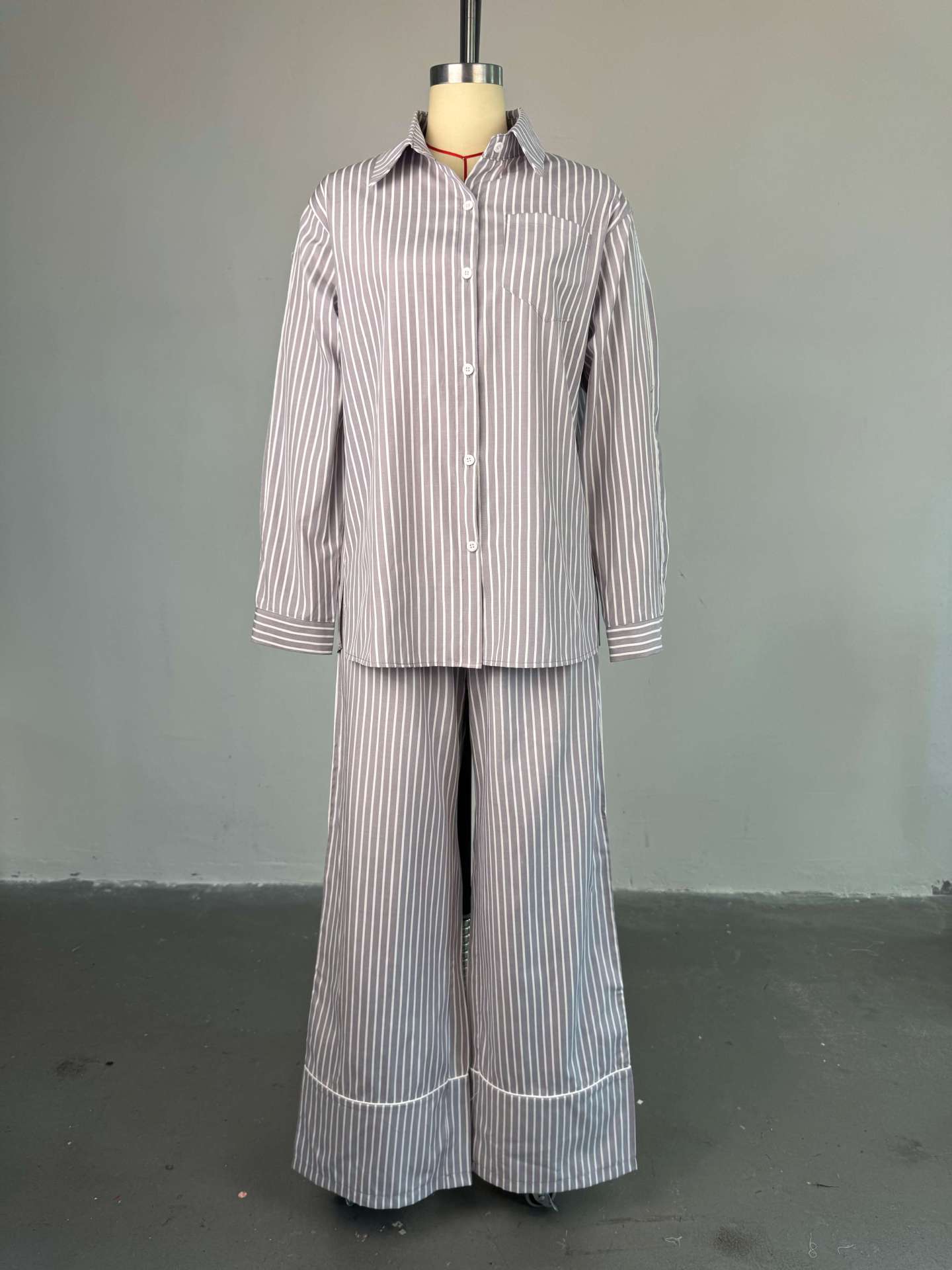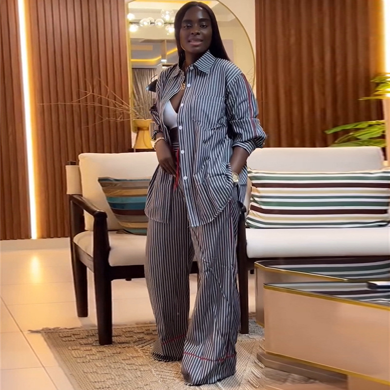 Copy| Product Name | Collar loose striped shirt wide leg pants set |