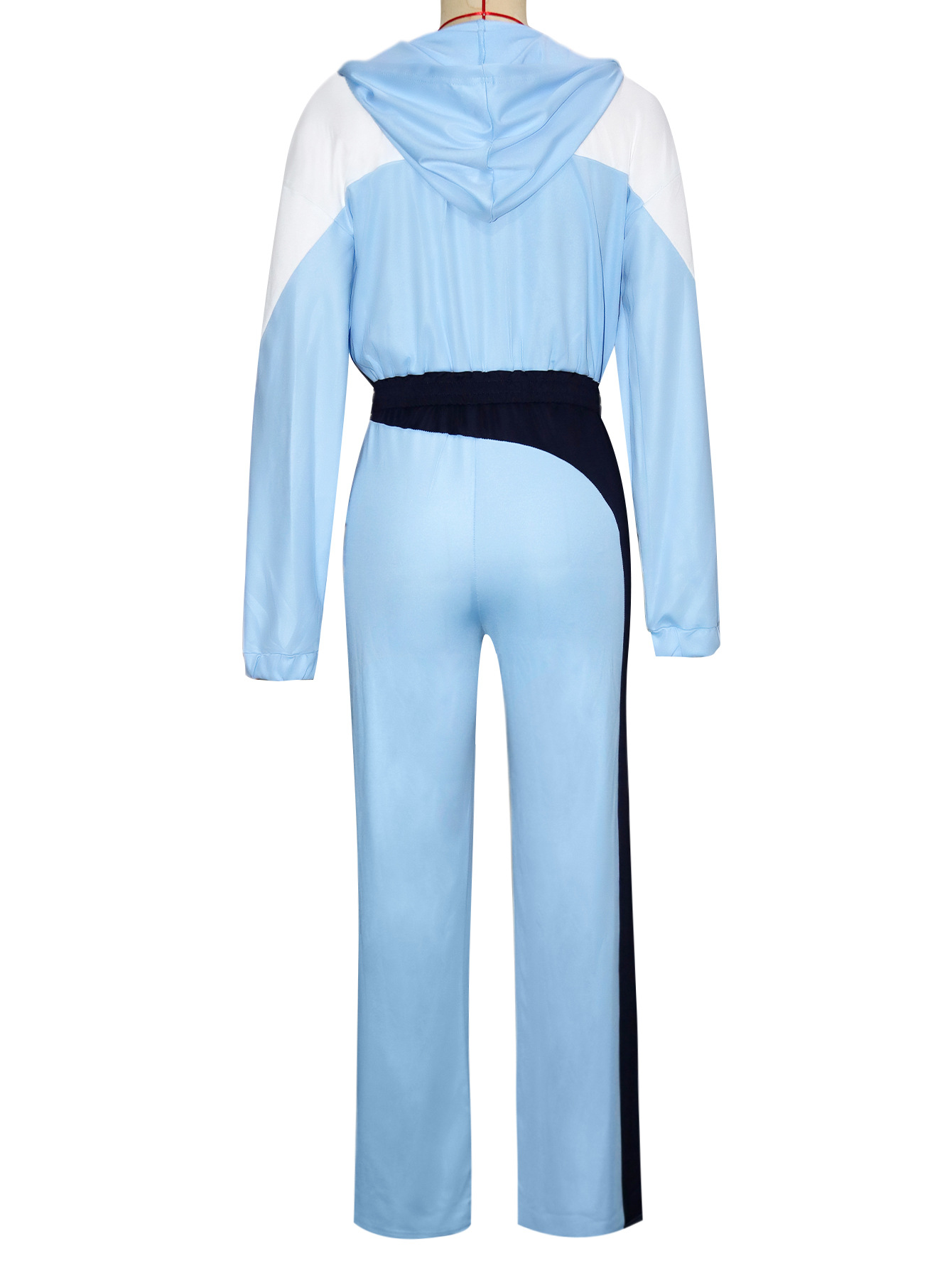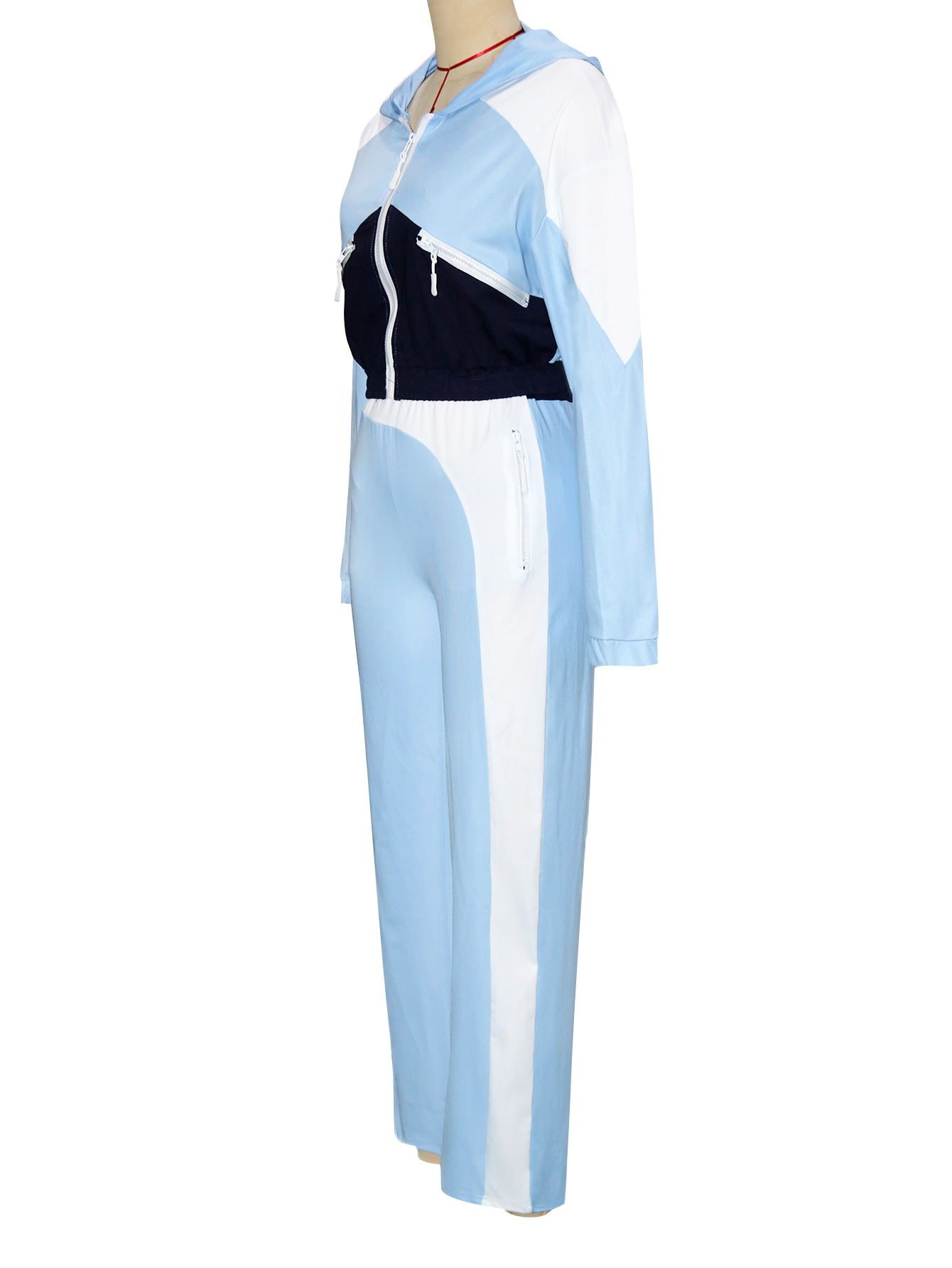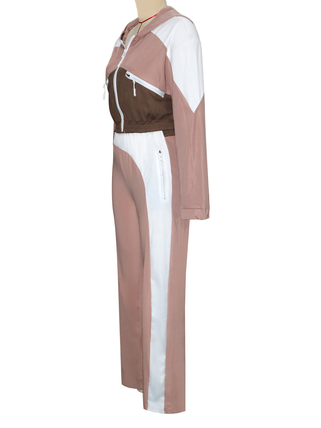 Copy| Product Name | Color blocked zipper cardigan wide leg elastic waist sports pants two-piece set |