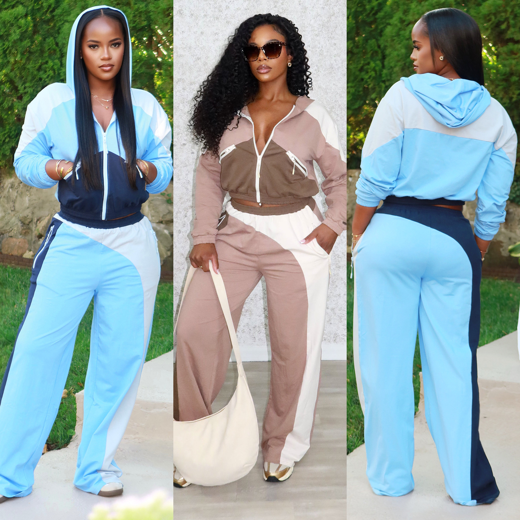 Color blocked zipper cardigan wide leg elastic waist sports pants two-piece set