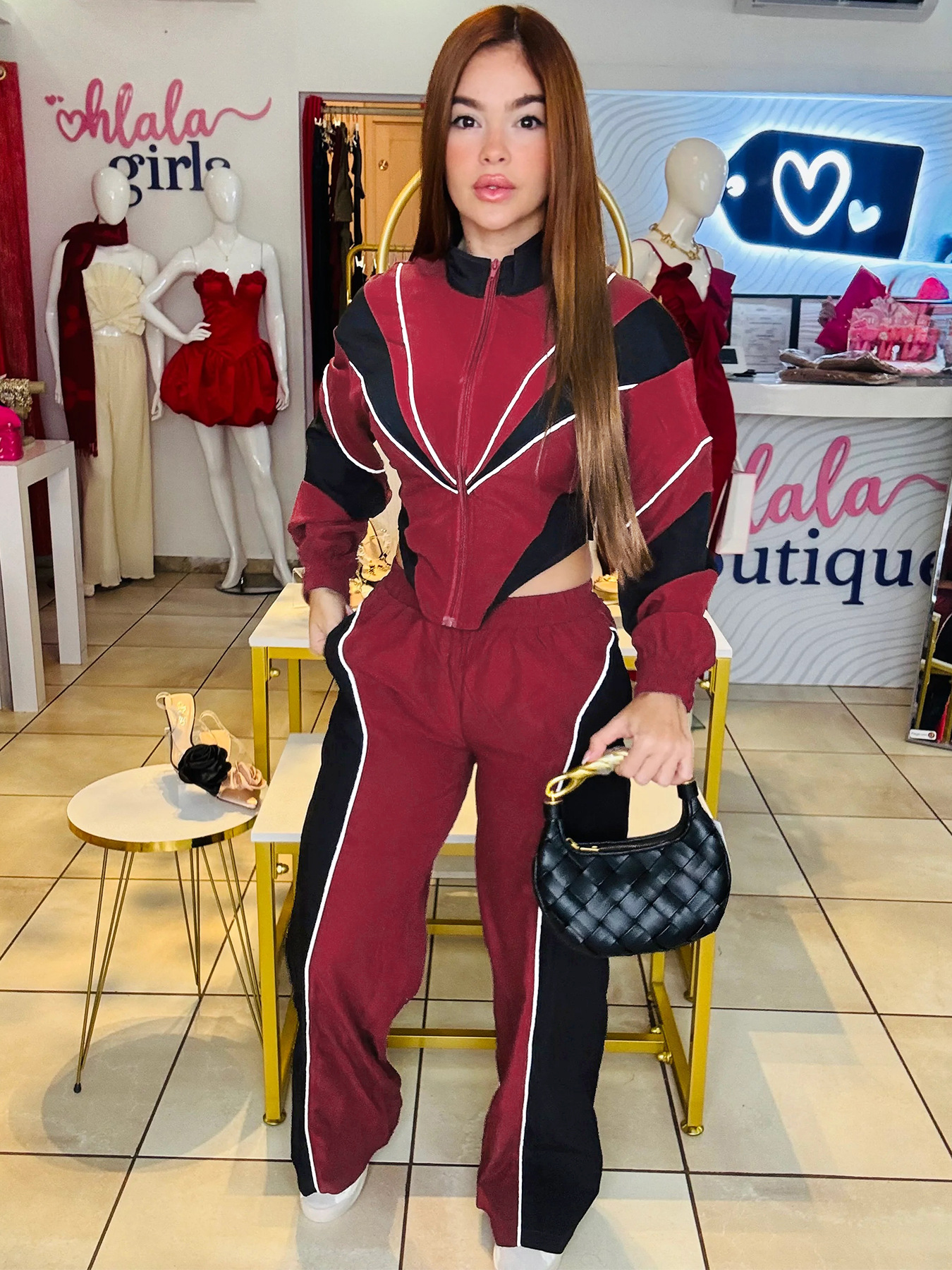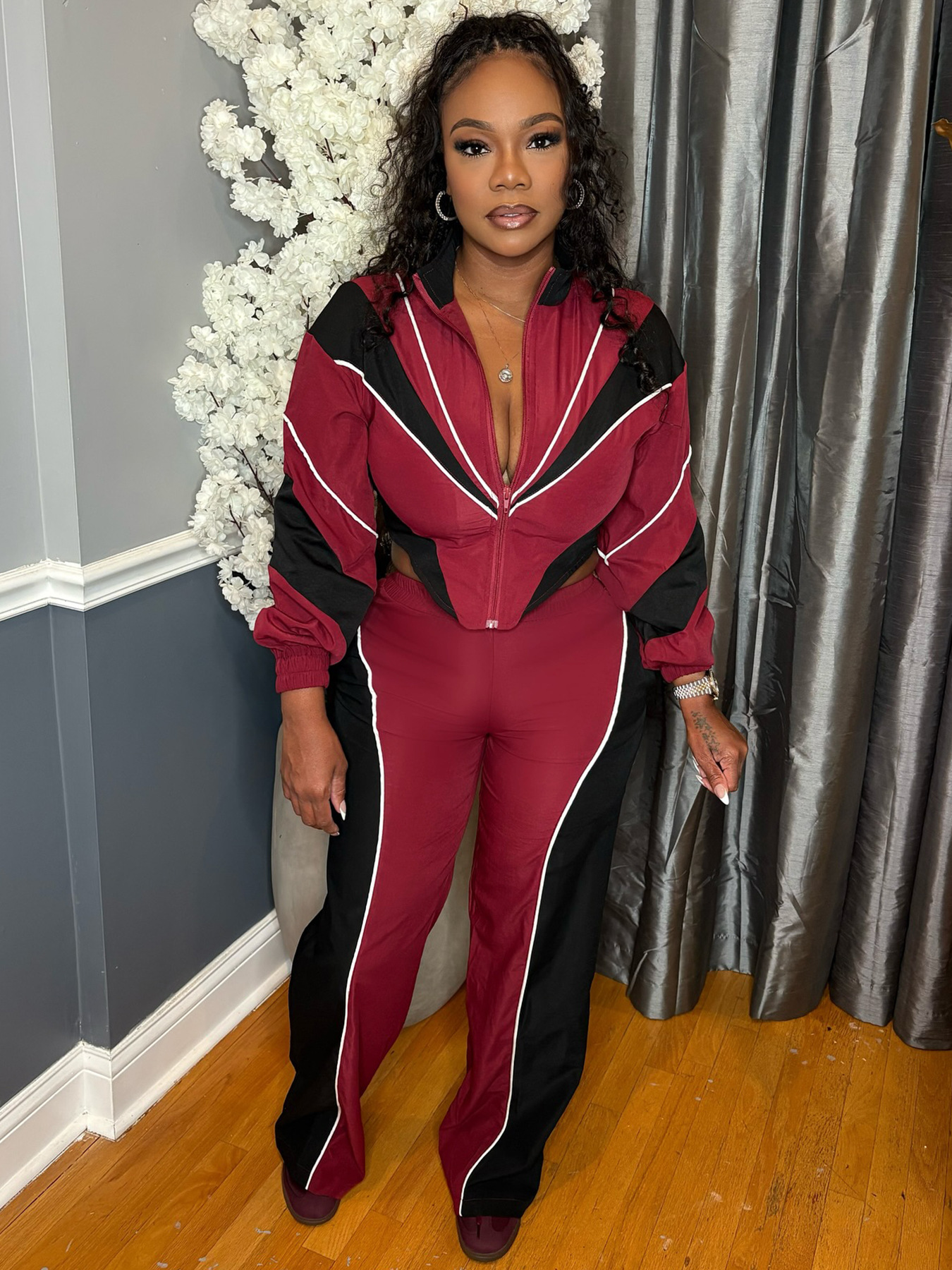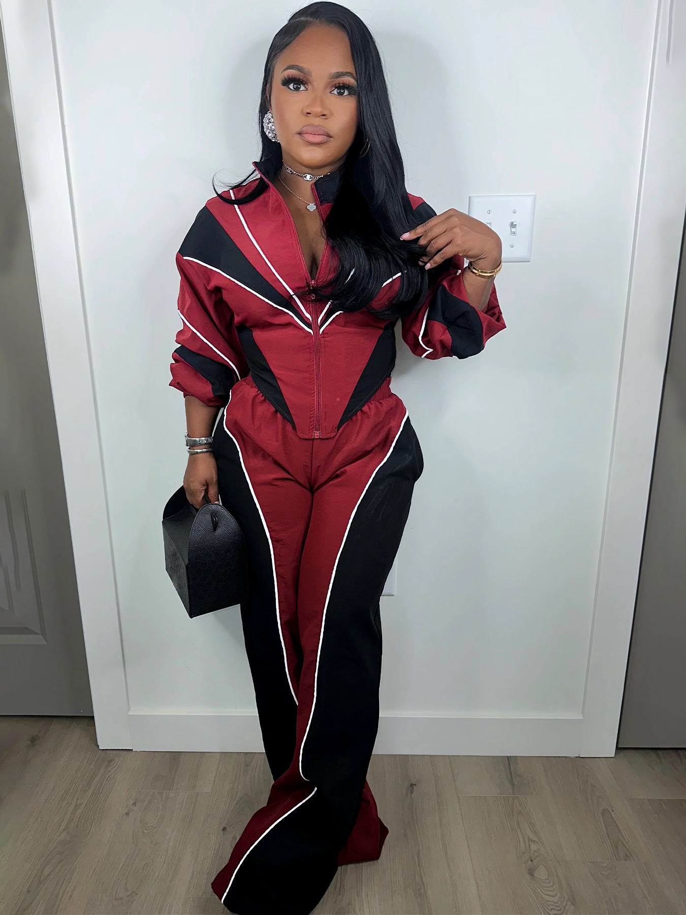 Color blocking splicing, zip up waist, zipper top, straight leg pants two-piece set