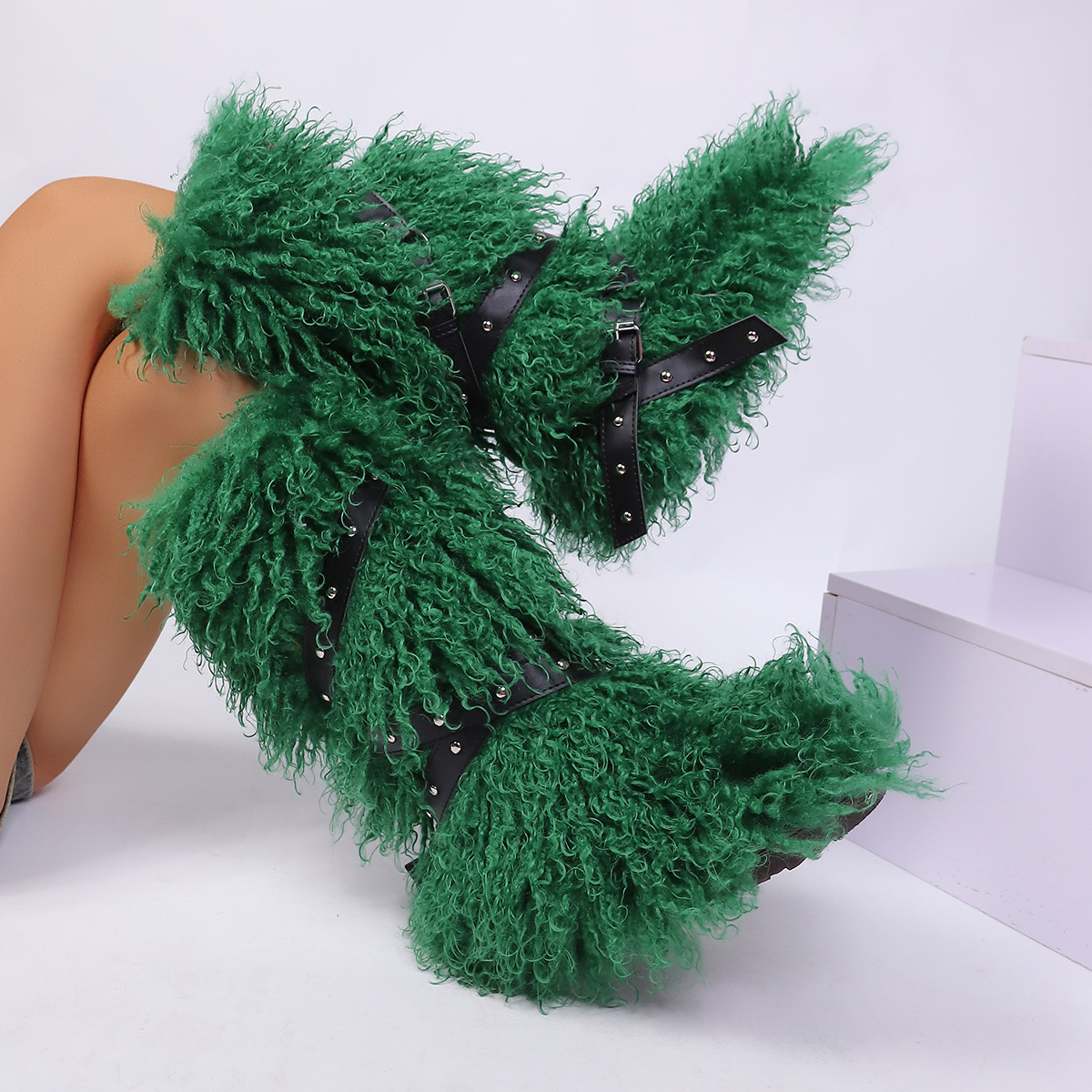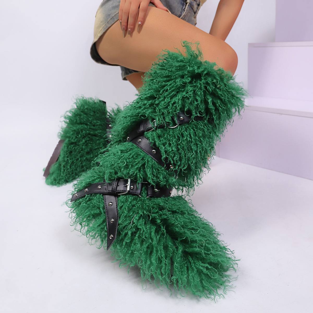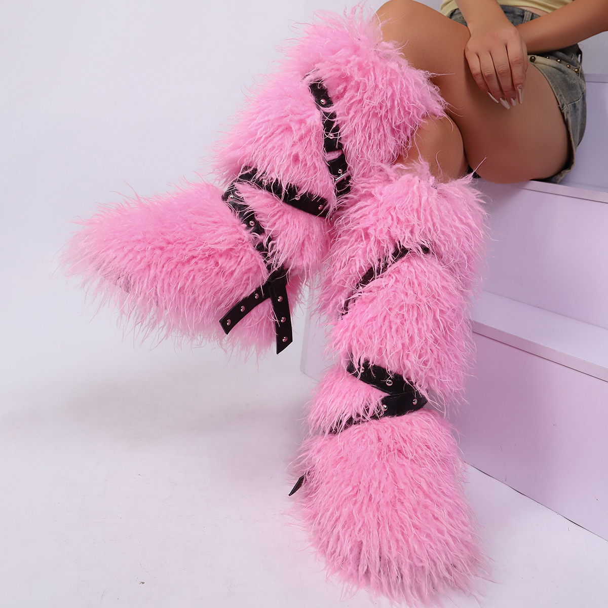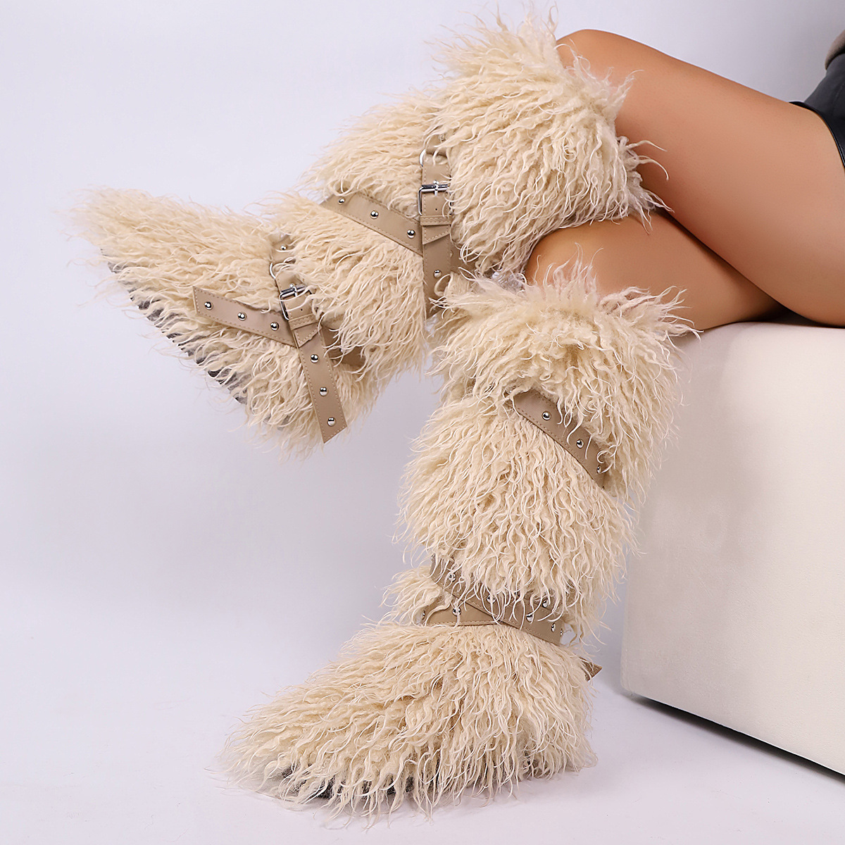 High end tied hairy boots with velvet rivets, fur snow boots |