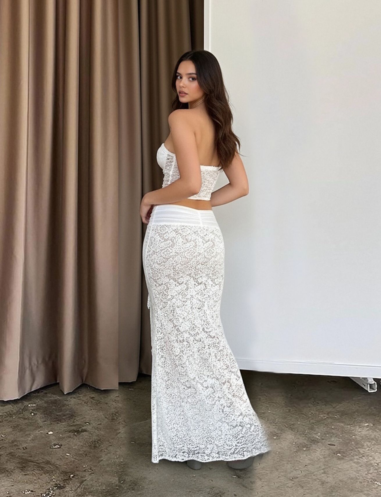 Home>Two Pieces Set>Two Piece Skirt Set>Irregular slit hip hugging long skirt strapless short top lace two-piece set