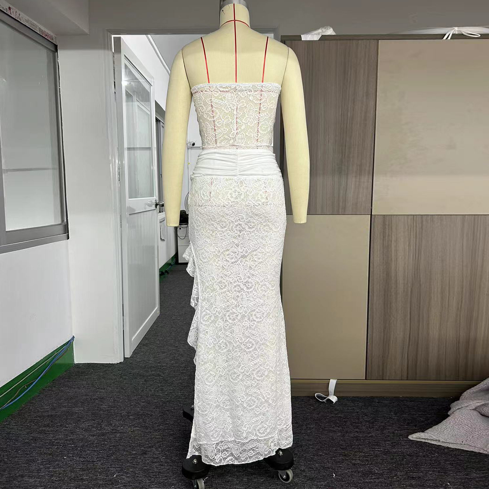 Copy| Product Name | Irregular slit hip hugging long skirt strapless short top lace two-piece set |