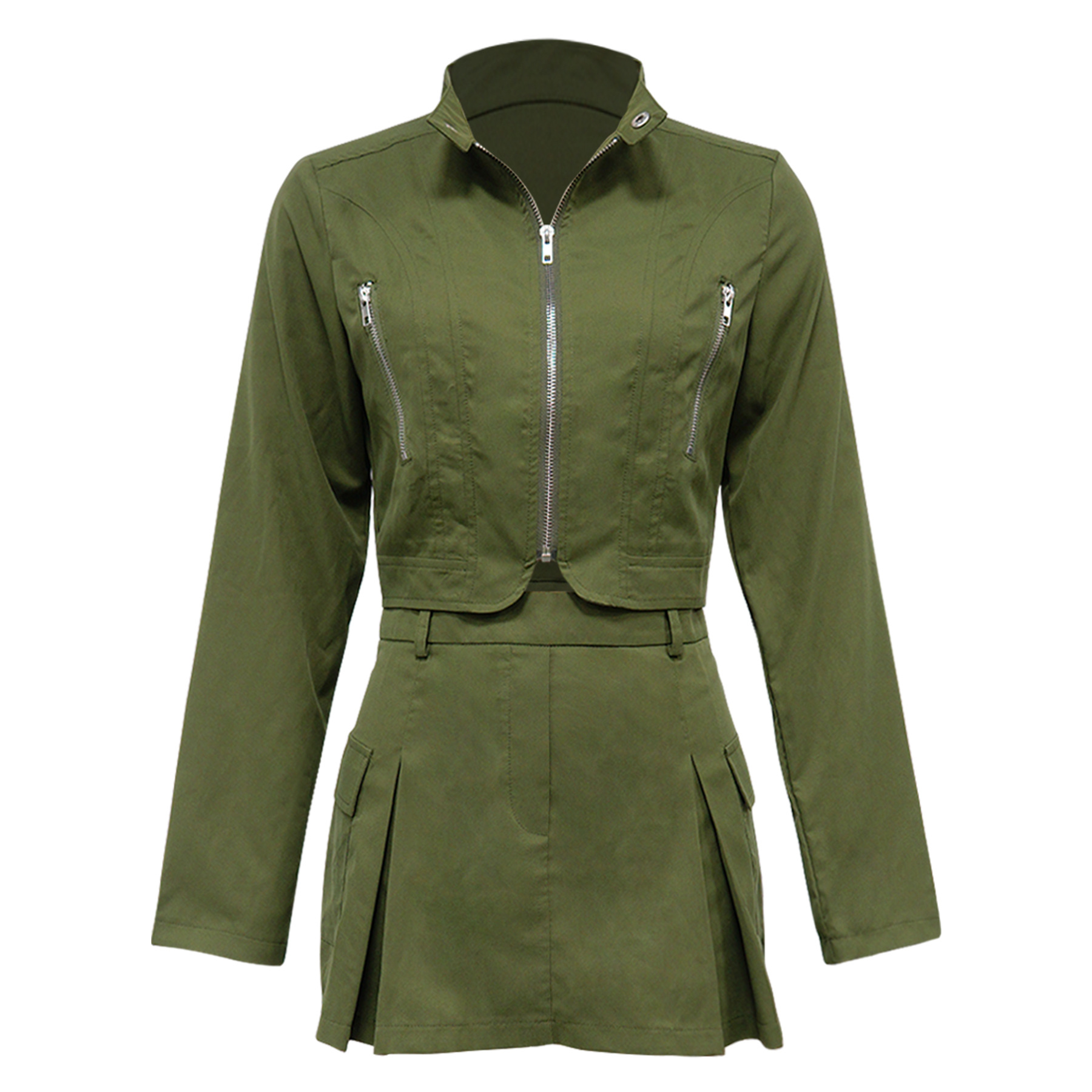 Long sleeved zipper top and short skirt two-piece set