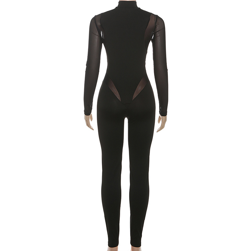 Perspective mesh zipper solid color long sleeved tight jumpsuit