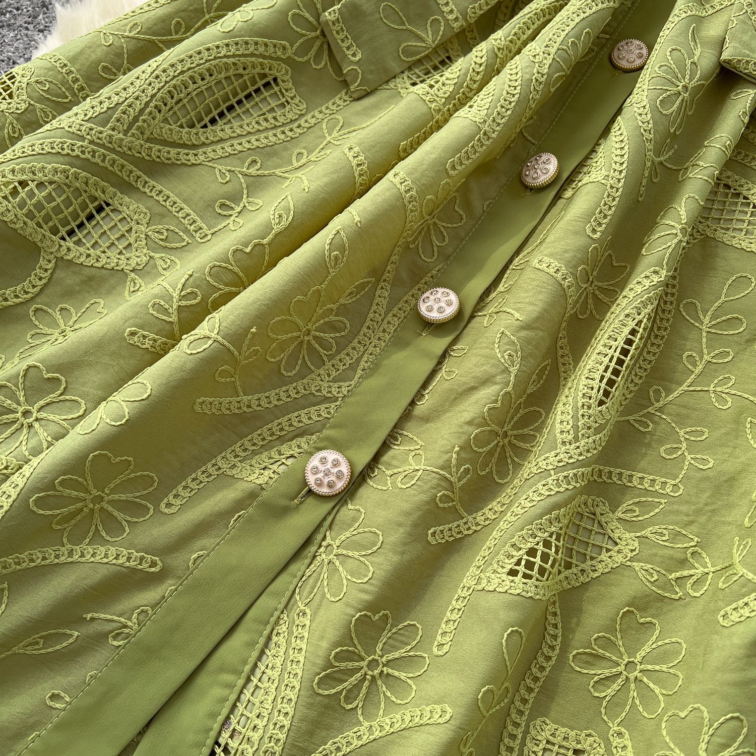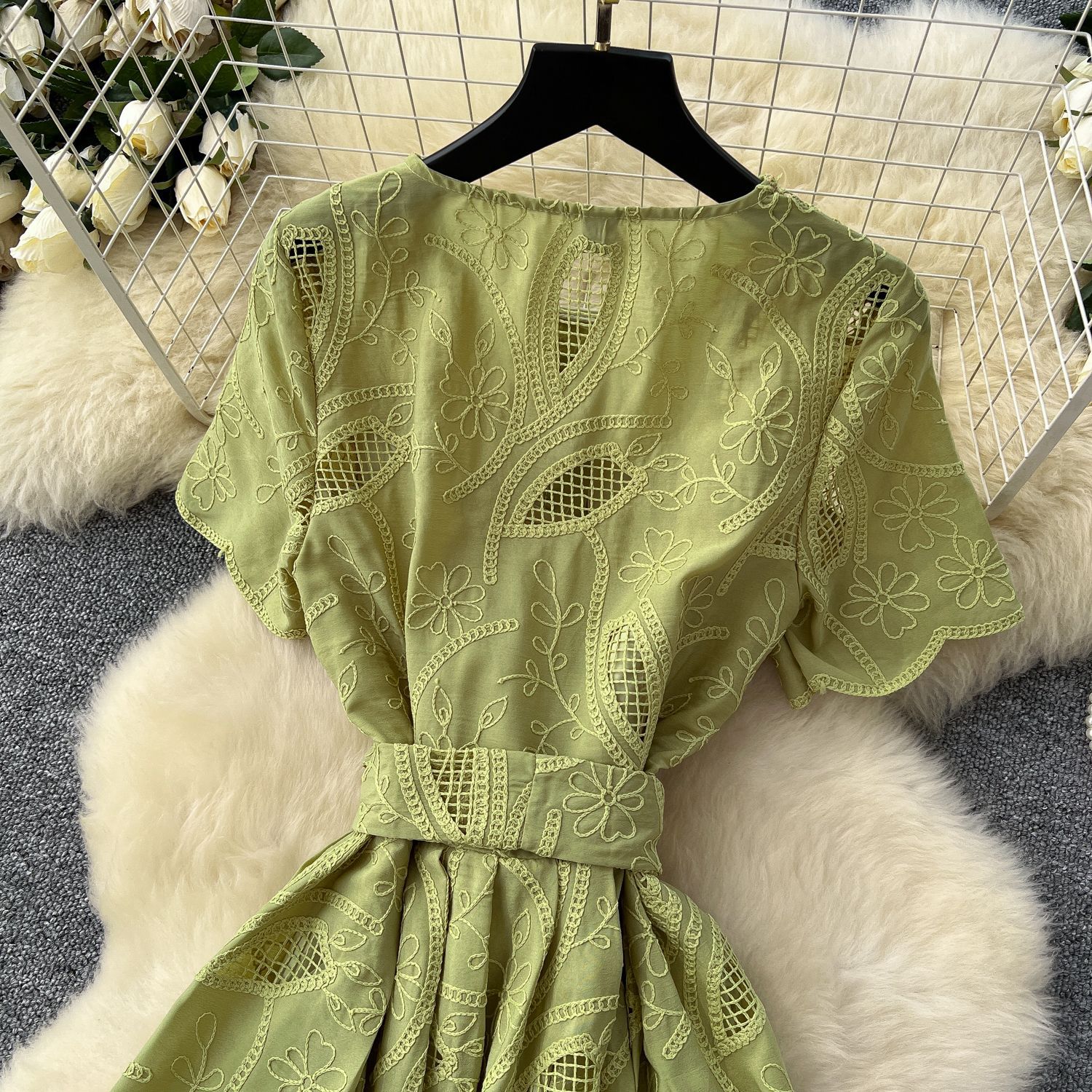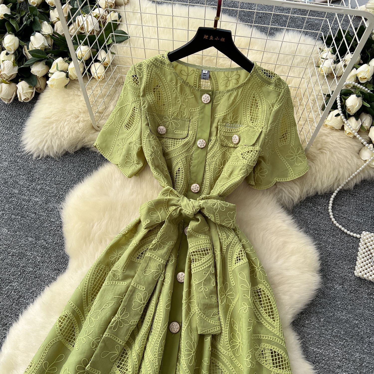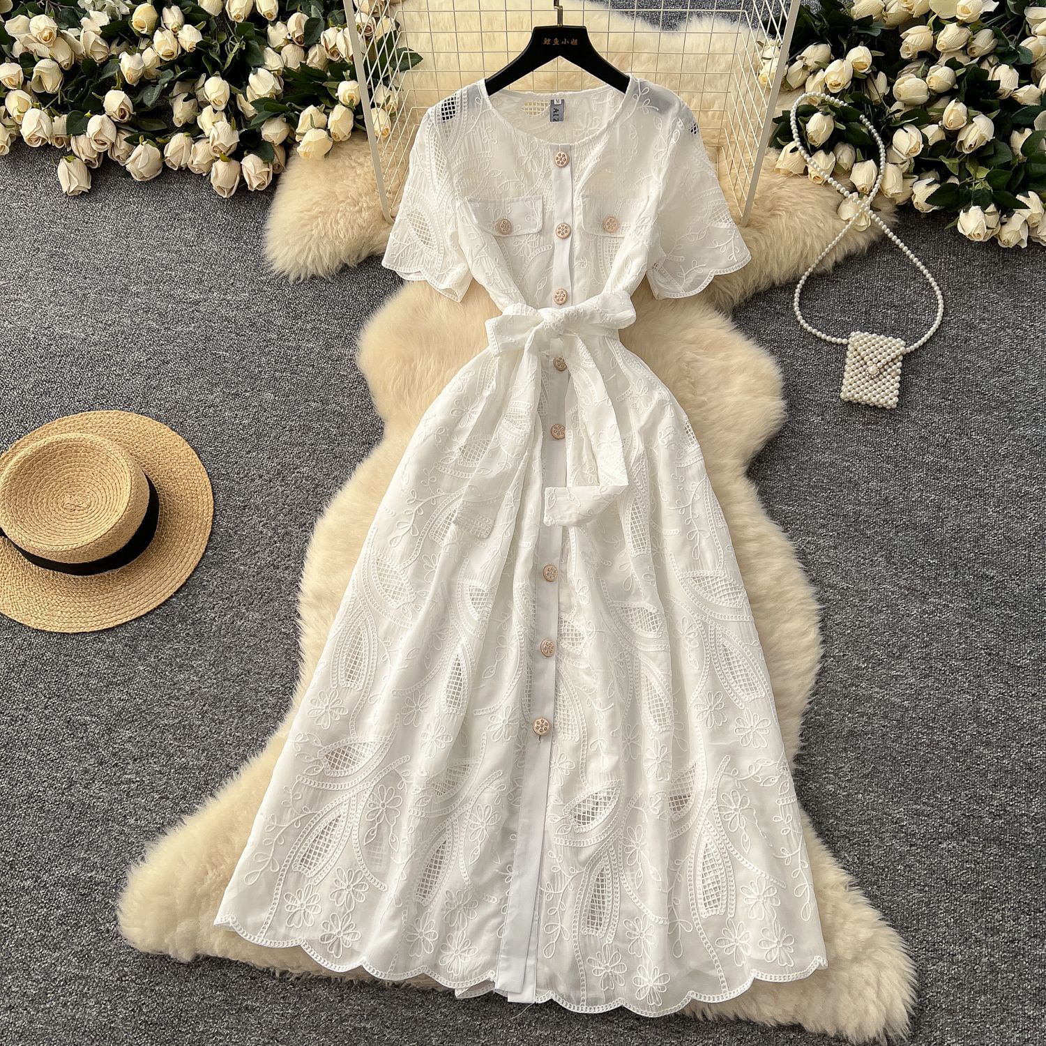 Copy| Product Name | Single breasted hollowed out embroidered round neck waist cinched short sleeved dress |