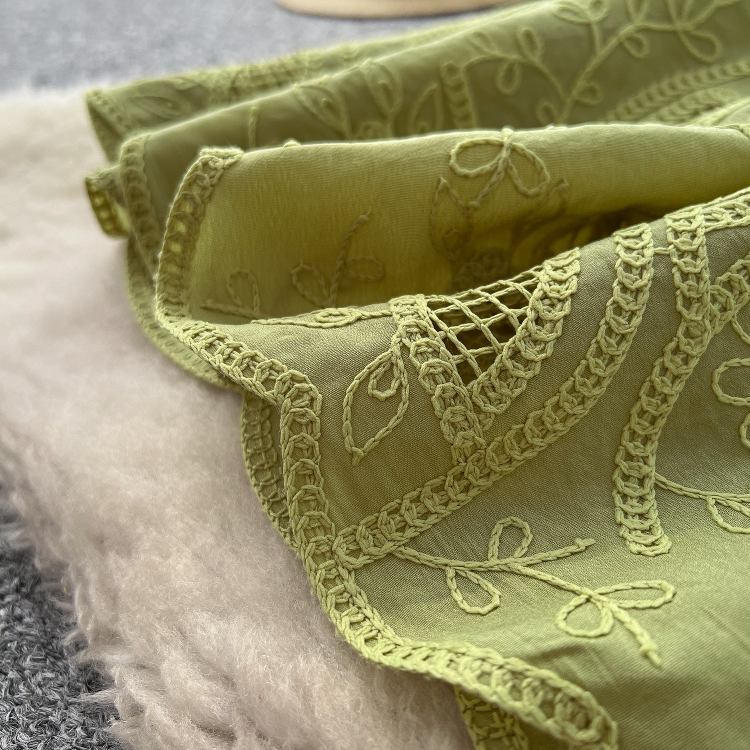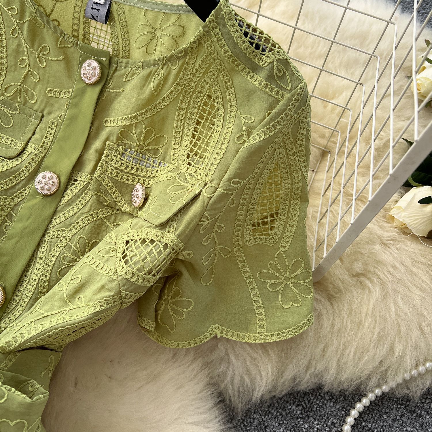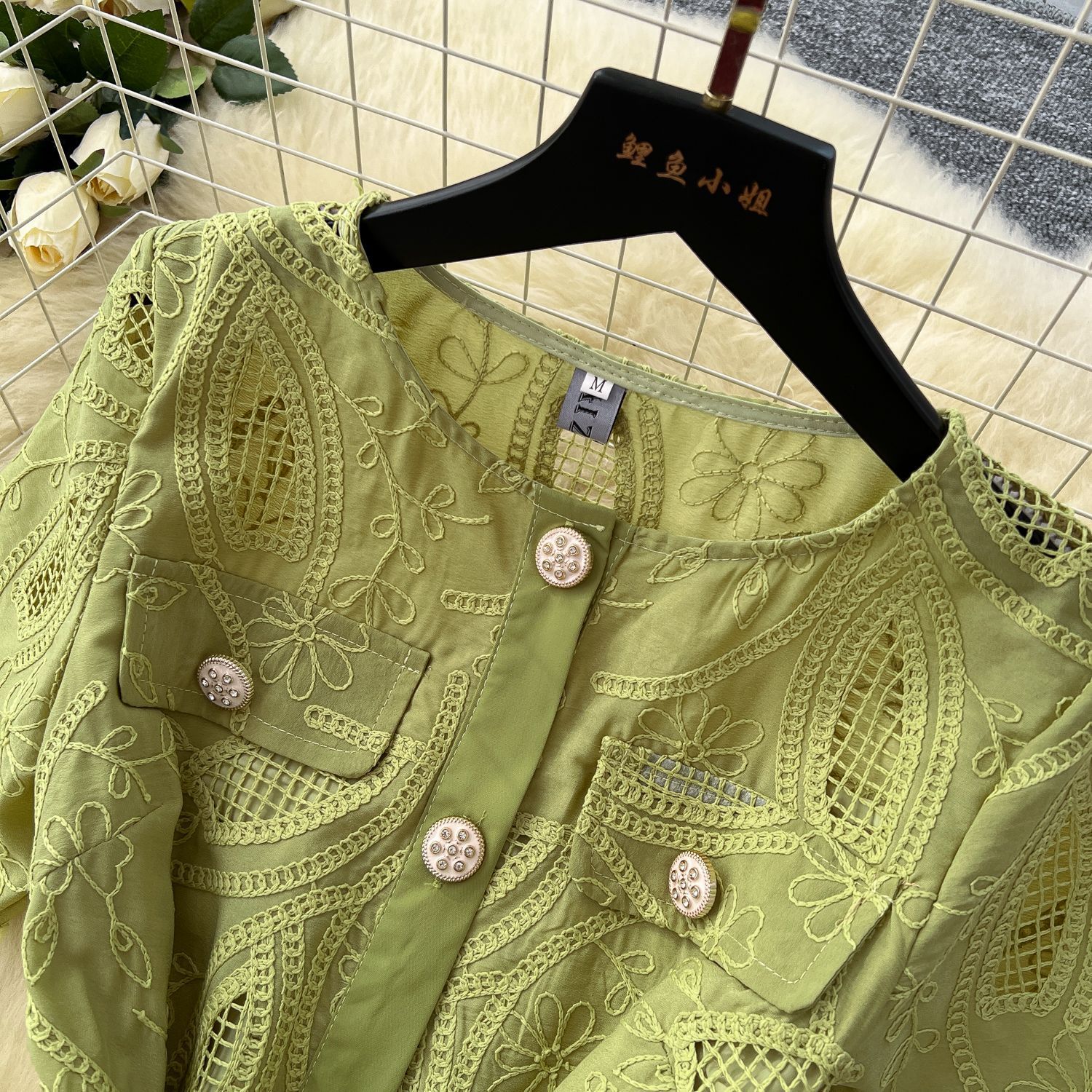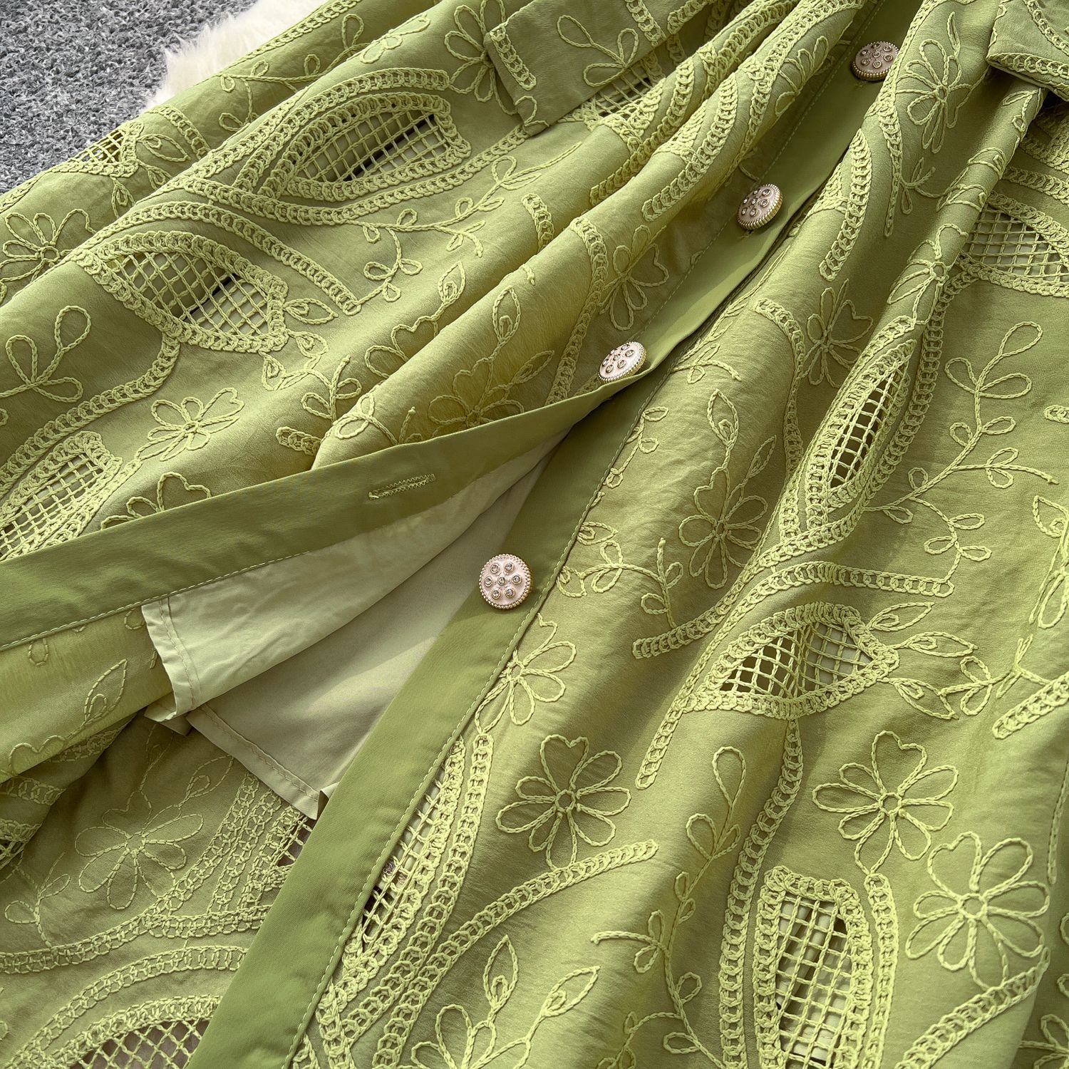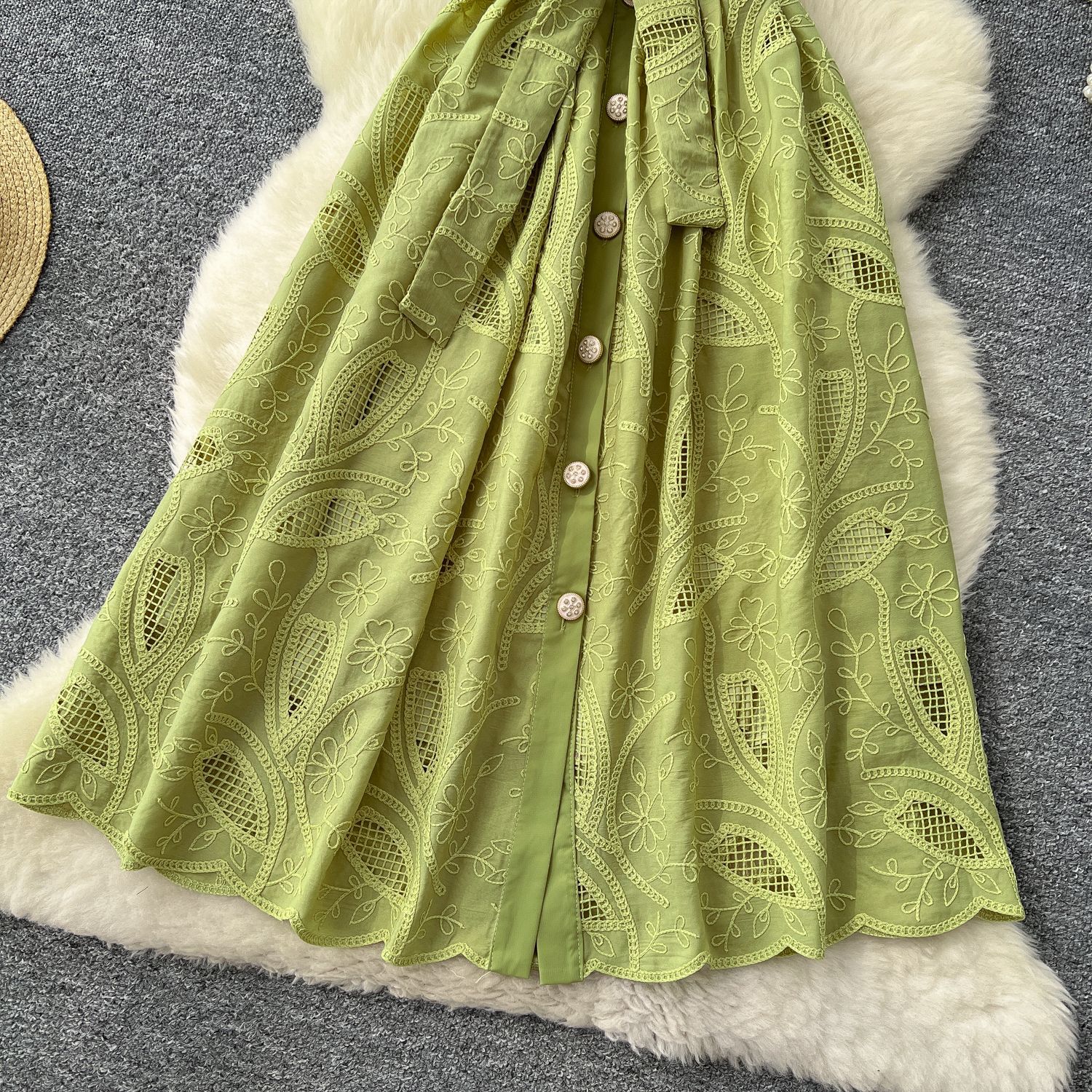 Copy| Product Name | Single breasted hollowed out embroidered round neck waist cinched short sleeved dress |