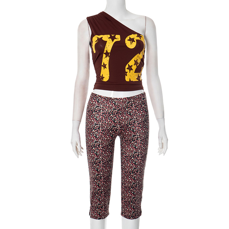 Home>Two Pieces Set>Two Piece Pants Set>Slant off shoulder digital offset printing low waist floral tight five point set