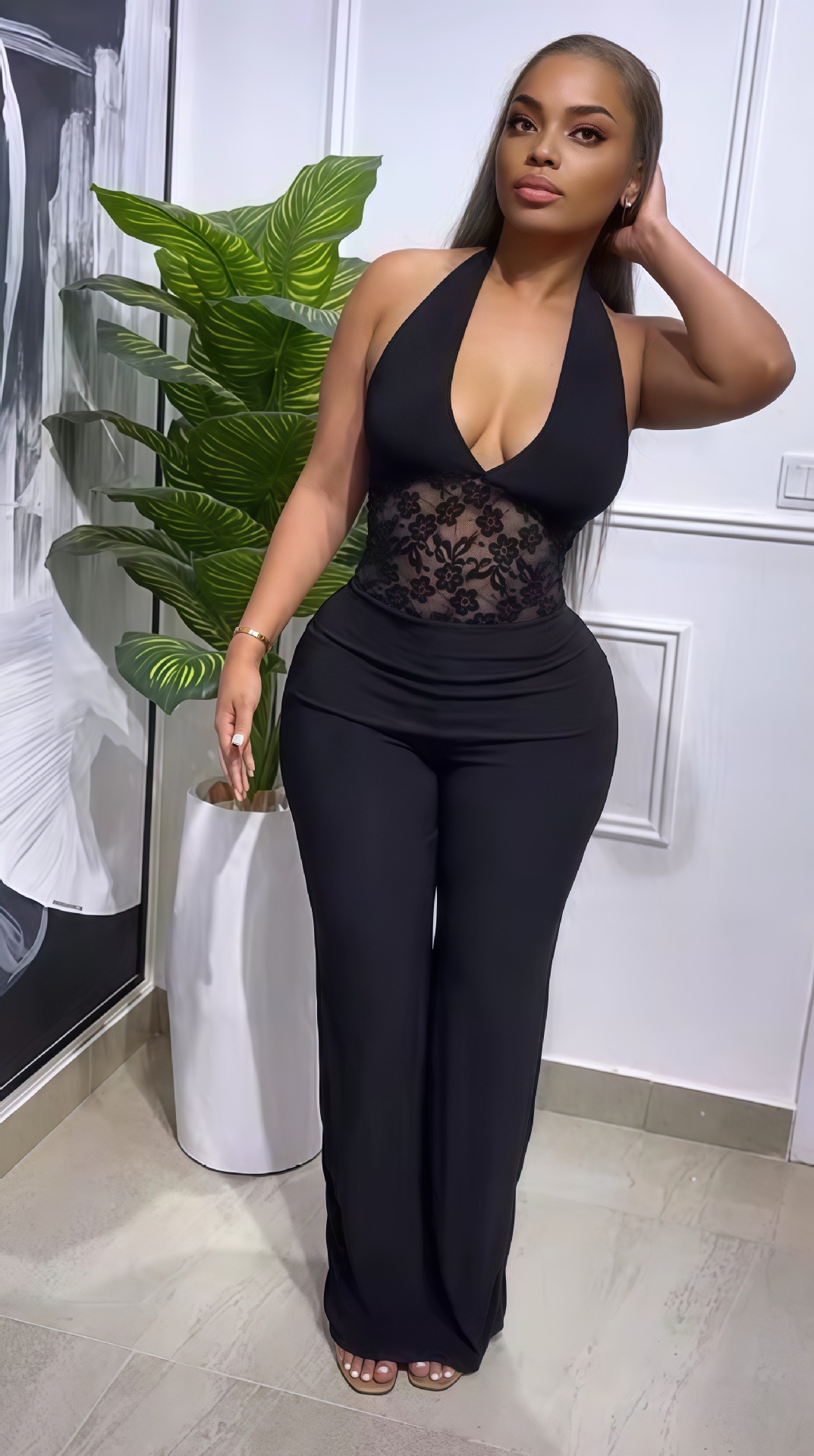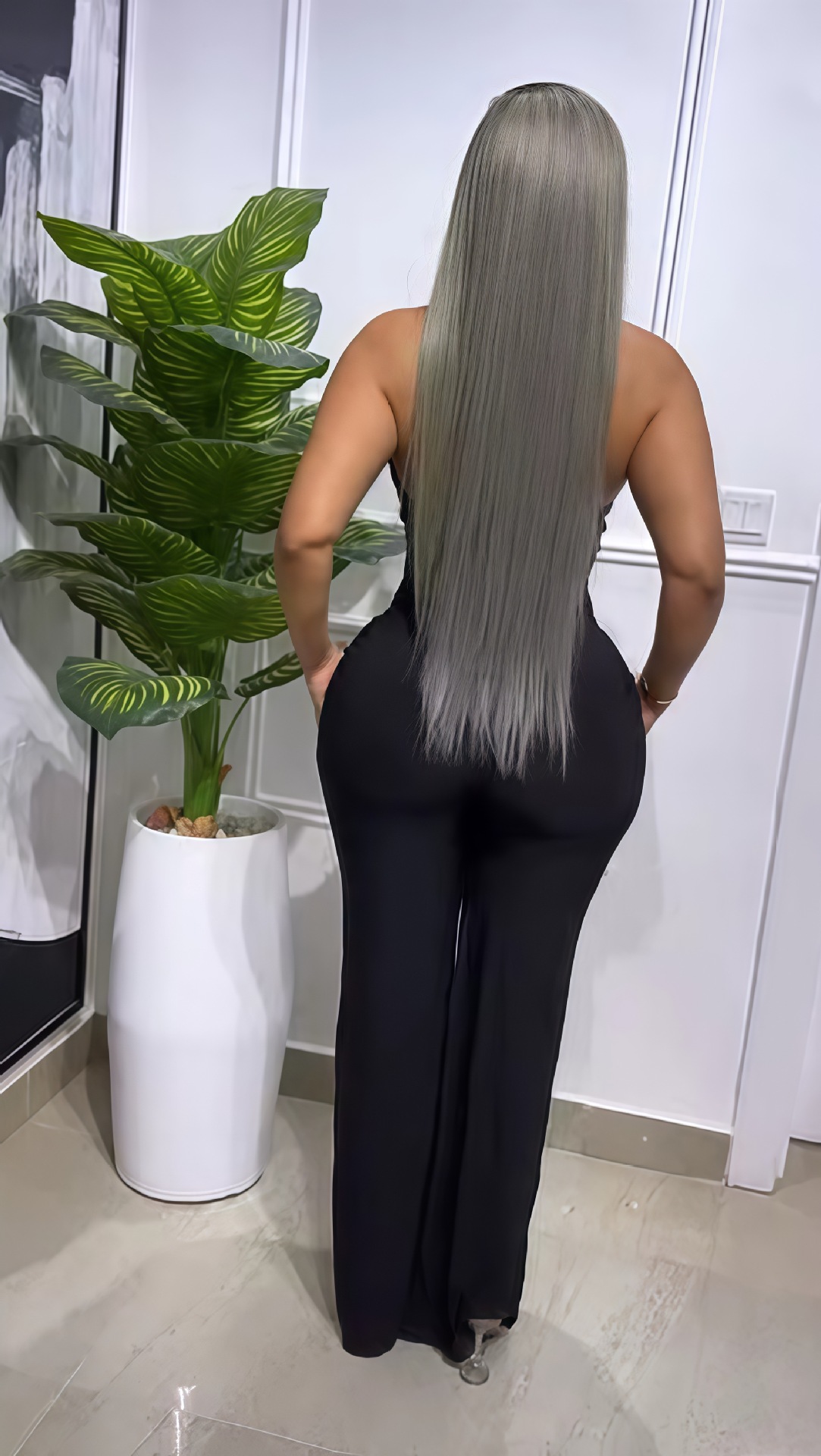 Copy| Product Name | Sleeveless deep V-neck hanging neck backless patchwork long jumpsuit |