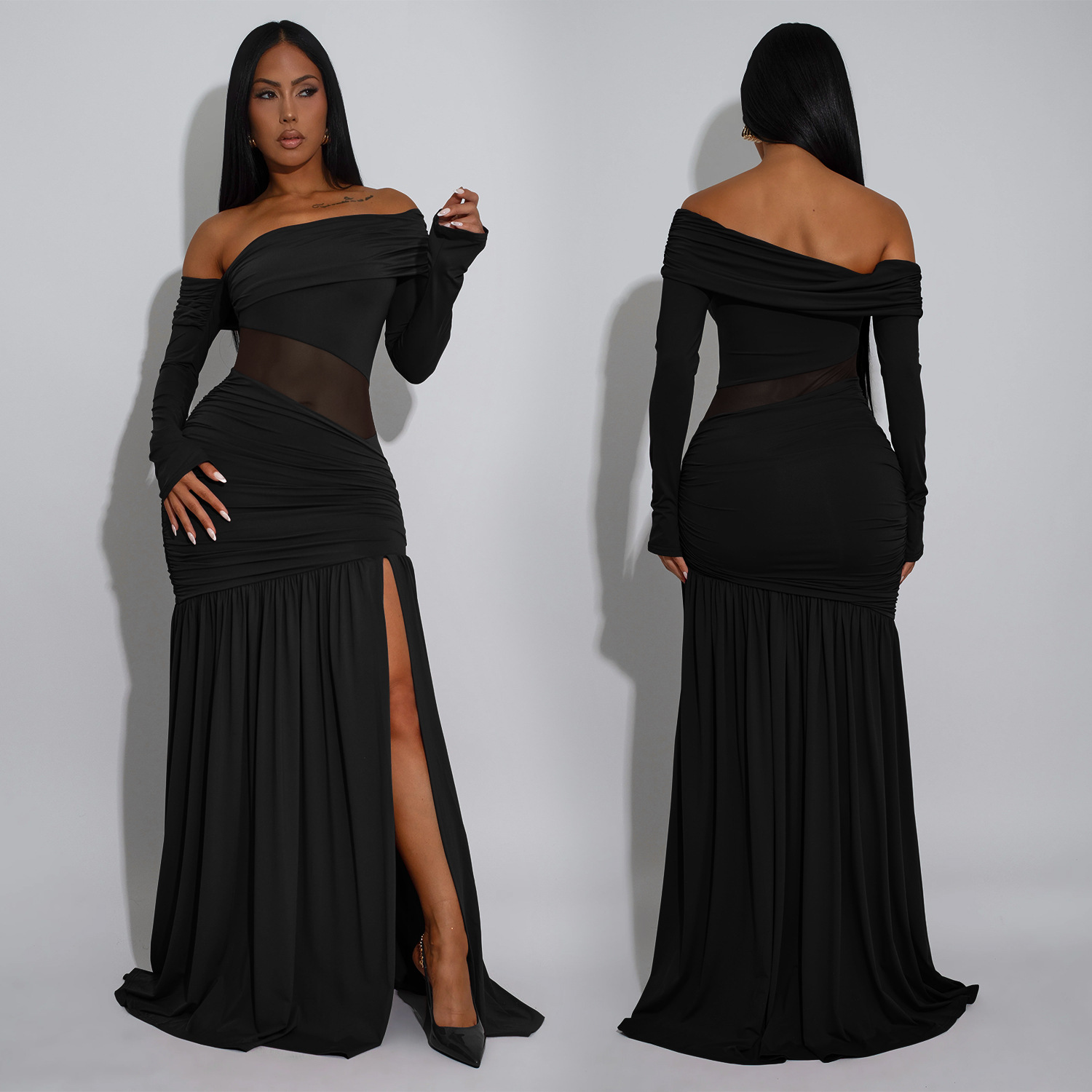 | Tag | dress , long , split , strapless , arm , sleeved |